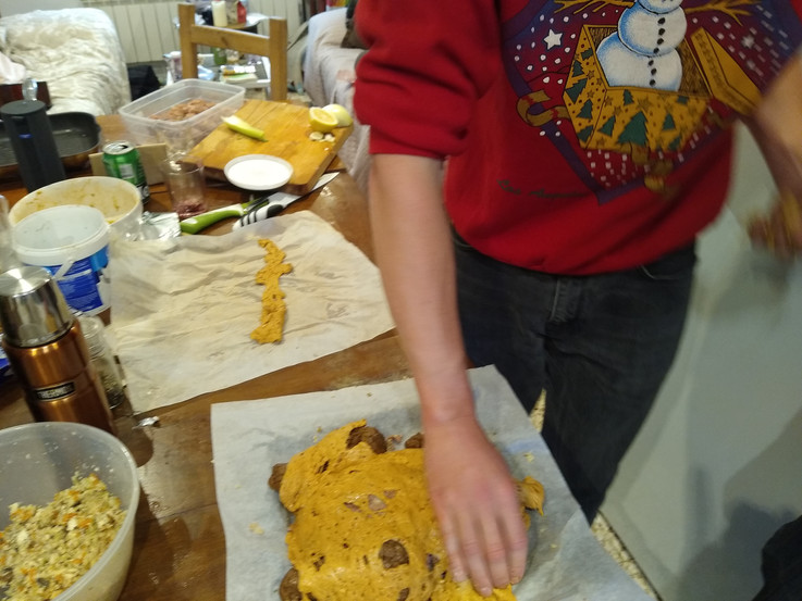 17) Bake the whole thing on a baking tray surrounded by the vegan mincemeat stuffing balls for around 45 minutes at 180 degrees.